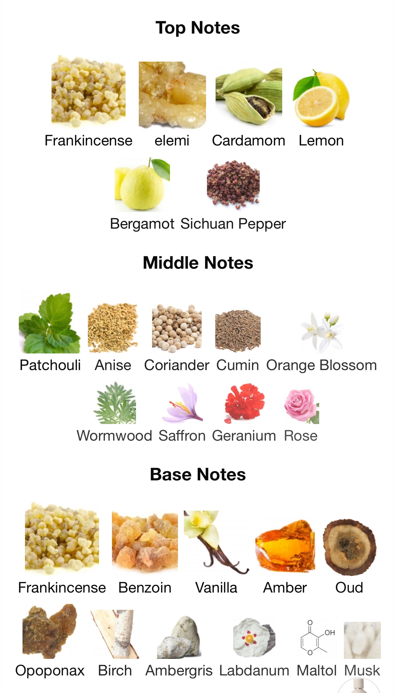 Benzoin, Labdanum, Amber, Ambergris, Frankincense, Opoponax, Vanilla, Birch, Oud, Musks |